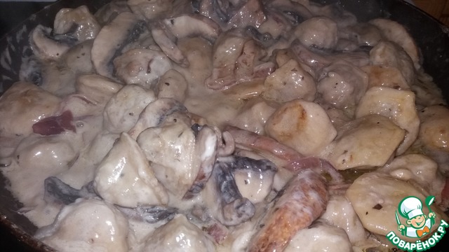Обожаю бефстроганов! И чтобы обязательно со спагетти или лингвини... Мммм... А еще хочется пельменей... Размышляла я, что же выбрать и что же приготовить в первую очередь, когда меня посетила мысль, что пельмени с телятиной - это в целом те же спагетти/лингвини с телятиной, а если добавить необходимые для бефстроганов ингредиенты, можно получить новое блюдо, которое будет сочетать в себе и пельмени, и телятину по-Строгановски. Получилось очень вкусно!!!