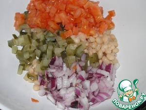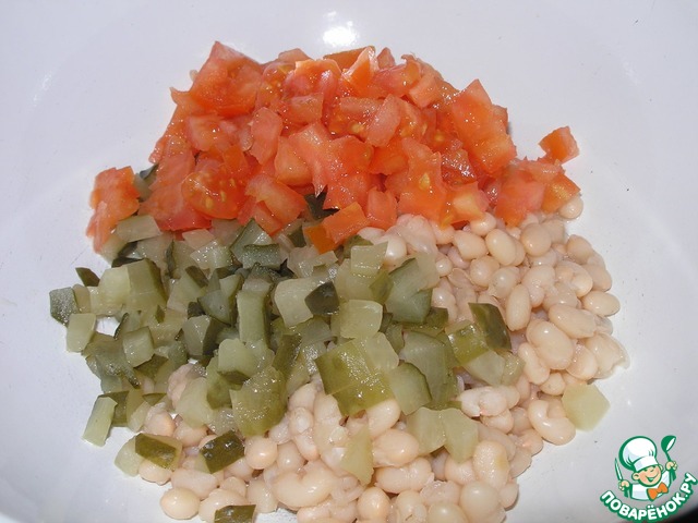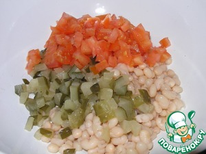 1 стакан сваренной белой мелкой фасоли ТМ "Мистраль" я перекладываю в миску и добавляю сюда нарезанные кубиками маринованный огурец, помидор.