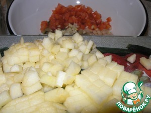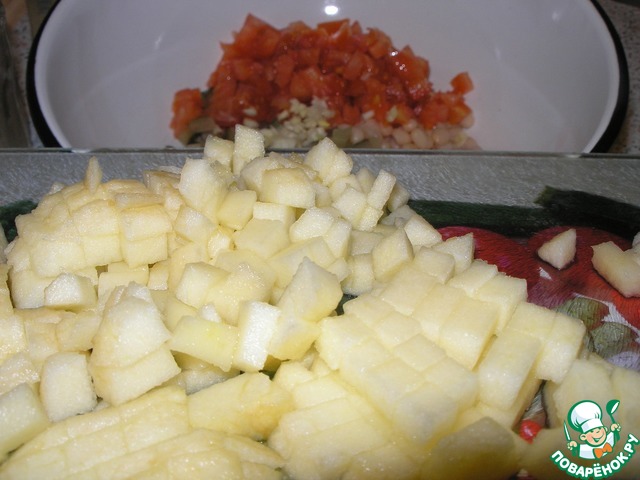 Теперь измельчить 1 зубочек чеснока и порезать кубиками яблоко, которое необходимо сбрызнуть лимонным соком.