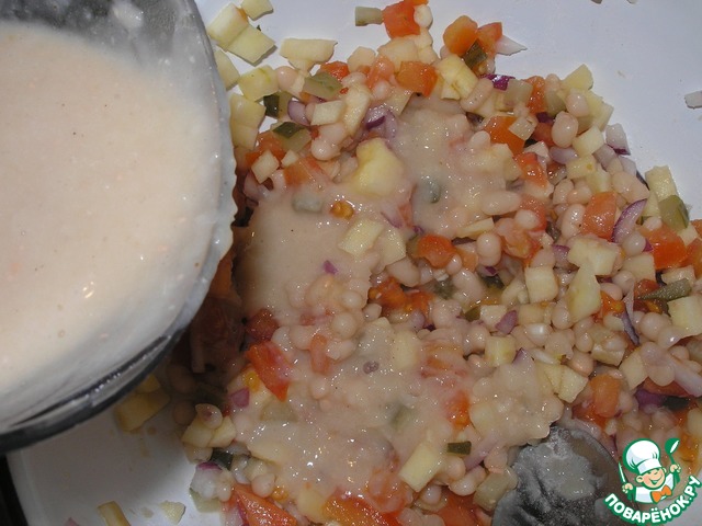 Добавляю фасолевый соус к закуске и тщательно перемешиваю. Не забыть попробовать по количество соли и при необходимости добавить.