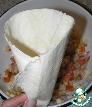 Из круга я формирую рожок, нижнюю часть которого я сгибаю и заворачиваю назад, чтобы начинка не выпала.