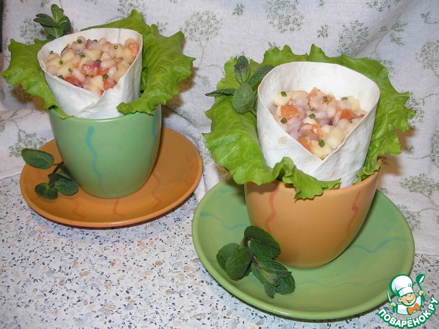 Декорирую посуду, в которой буду подавать закуску, с помощью листьев салата и веточек мяты. Рожок наполняю закусочной смесью, сверху присыпать укропом.