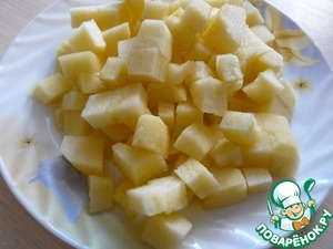 Рис промыть, залить водой, посолить и поставить вариться. Варим до готовности. Тем временем моем и чистим яблоко. У меня кисло-сладкое. Нарезаем маленькими кубиками.