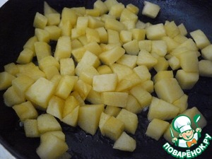 На сковороду наливаем 1 столовую ложку растительного масла, высыпаем сахар, ждем пока нагреется и отправляем к ним яблоки. Обжариваем на небольшом нагреве.
