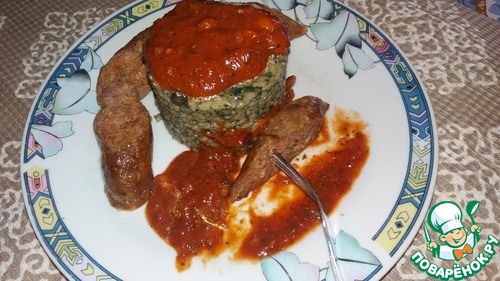В небольшой кастрюле или глубокой сковороде разогреть оливковое масло, пассеровать нарезанный лук и чеснок, добавить оливки, нарезанный помидор, петрушку и базилик, виноградный сироп, соль и перец, всю смесь проварить немного, а затем добавить томатный сок. |