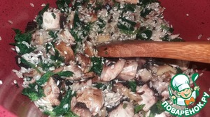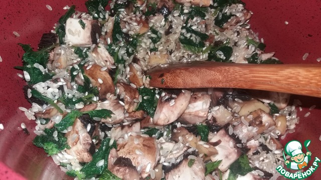 В кастрюле разогреть масло, выложить грибы, крапиву и рис. Пассеровать в течение 5 минут. |