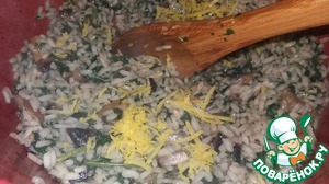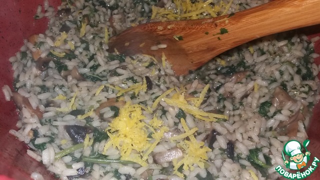 Постепенно подливаем бульон, помешивая. Варим на среднем огне до готовности риса. Добавляем цедру, соль и перец. |
