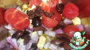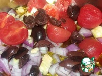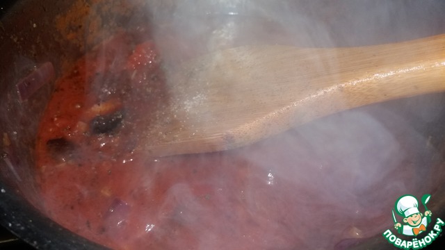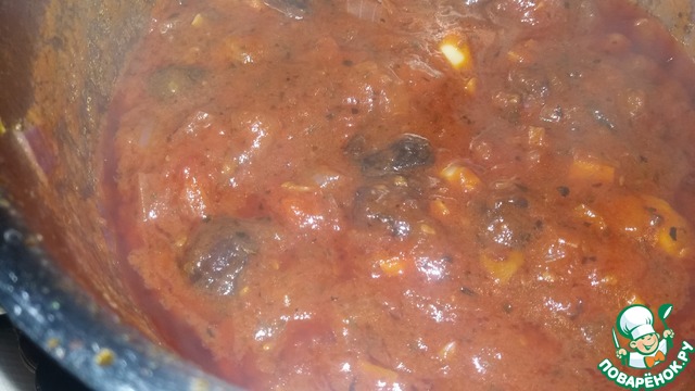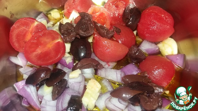В небольшой кастрюле или глубокой сковороде разогреть оливковое масло, пассеровать нарезанный лук и чеснок, добавить оливки, нарезанный помидор, петрушку и базилик, виноградный сироп, соль и перец, всю смесь проварить немного, а затем добавить томатный сок. |