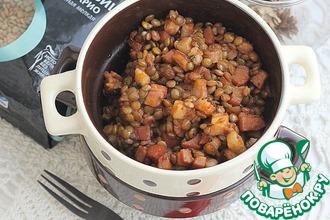 Сверху закрываем оставшейся чечевицей и сбрызгиваем оливковым маслом, закрываем крышкой. Ставим в духовку на 20-25 минут.