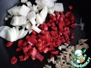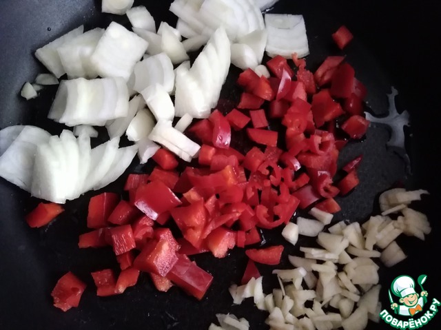 Лук, перец и чеснок обжариваем на небольшом количестве растительного масла около 10 минут.
