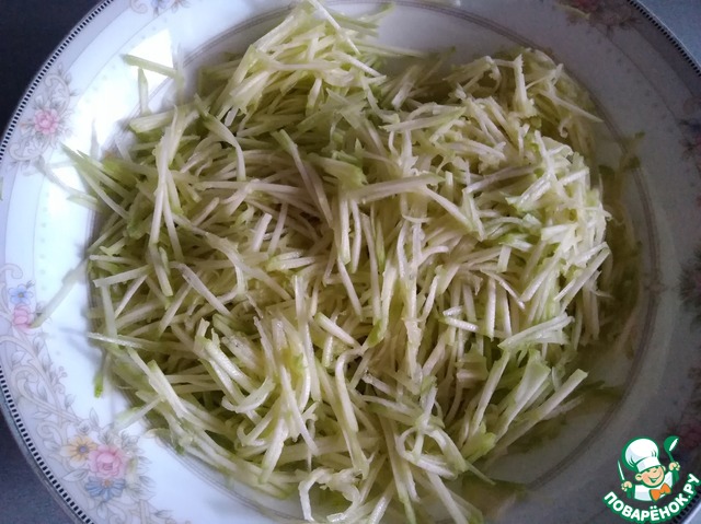 Цуккини натираем на терке и подсаливаем для выделения сока. На это потребуется пара минут. Затем цуккини отжимаем, но без фанатизма.
