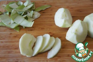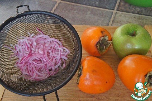 Если хурма все таки имеет небольшой вяжущий привкус, как случилось у меня, очистить её от кожицы, разрезать пополам, вырезать серединку и нарезать полукольцами не очень тонко.