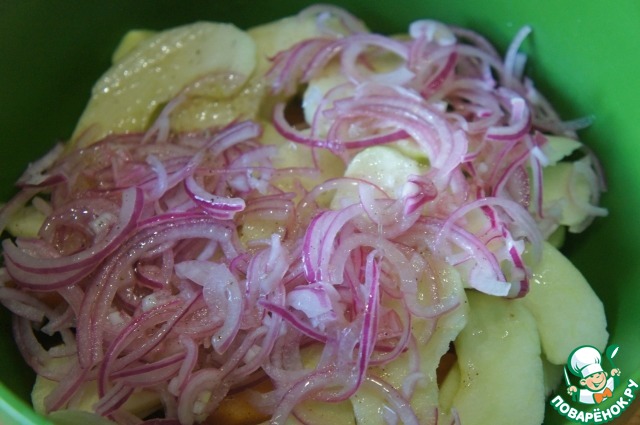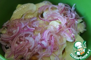 Лук нарезать тонкими полукольцами и залить на пару минут кипятком, чтобы ушла горечь. Мне больше нравится слегка замариновать лук, для чего заливаю водой, добавляю немного сахара и уксуса, чтобы на вкус маринад был кисленьким, держу 20 минут, затем промываю холодной водой и слегка отжимаю.