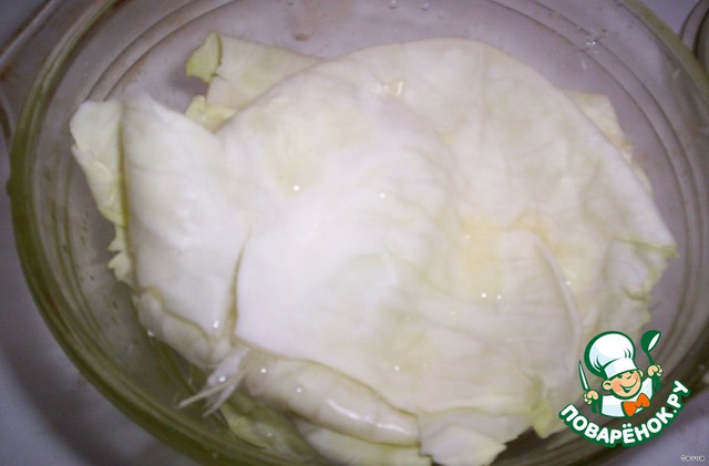 - Капустные листы посолить, добавить лимонный сок + 1 ст. ложка воды, прогреть в микроволновке до мягкого состояния, слить жидкость, остудить.