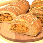 На бОльшую часть теста (без разрезов) равномерно выложить начинку, отступив от краев по 1-1,5 см.