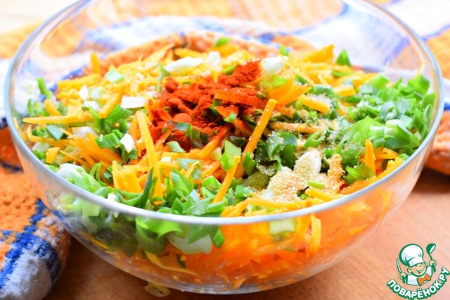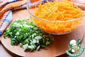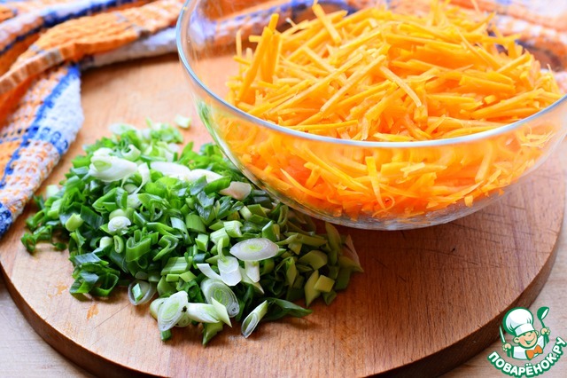 Тыкву нарезать тонкой соломкой или натереть ее на терке для корейских салатов. Зеленый лук нарезать не очень мелко. -