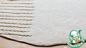 Рабочую поверхность присыпать мукой, выложить на нее тесто, тесто слегка обмять и раскатать в пласт толщиной примерно 6-7 мм.