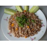 Отварить перловую крупу до полуготовности. Я это делаю таким образом: перловку тщательно промыть в проточной воде до тех пор, пока вода не станет прозрачной. Залить крупу крутым кипятком, укутать кастрюлю с перловкой в полотенце и оставить на ночь. Утром слить воду, вновь залить крупу кипятком и варить 10-15 минут. Затем откинуть крупу на дуршлаг и дать стечь воде.