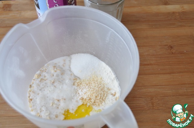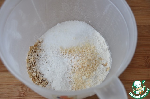 В миску кладём муку, сахар и овсяные хлопья.