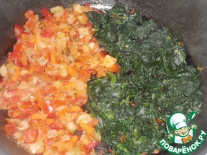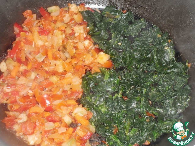 Всыпать две ст. л. муки, тщательно перемешать и добавить шпинат, тушить до готовности. Добавьте немного овощного бульона или воды, что бы получился не жидкий соус, прокипятить.