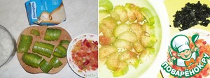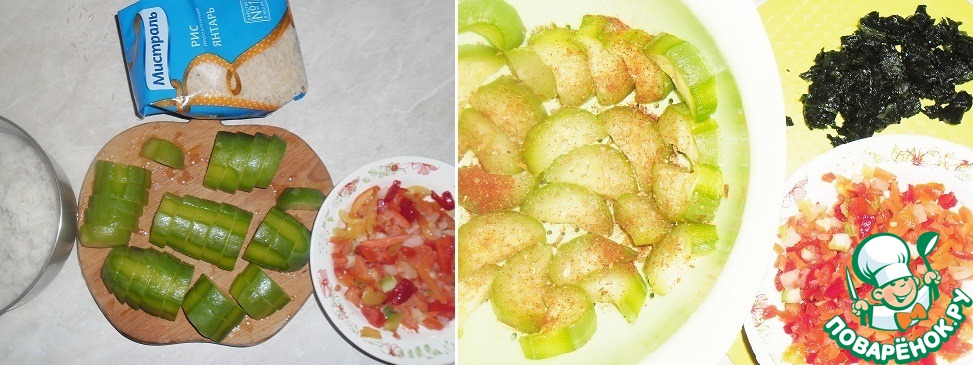 В центр рисового кольца выкладываем кабачки (на дно и по краям).