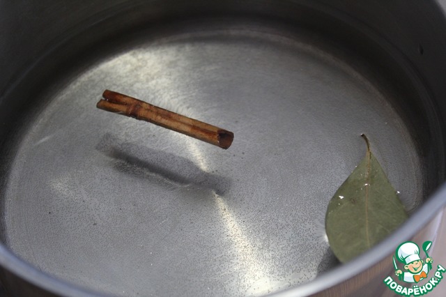 В сотейник налить воду, положить лавровый лист и палочку корицы, поставить на огонь.