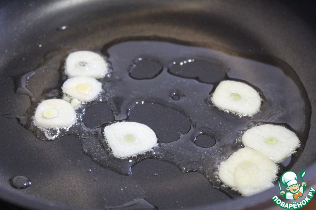 В двух столовых ложках оливкового масла обжарить чеснок, нарезанный пластинками.