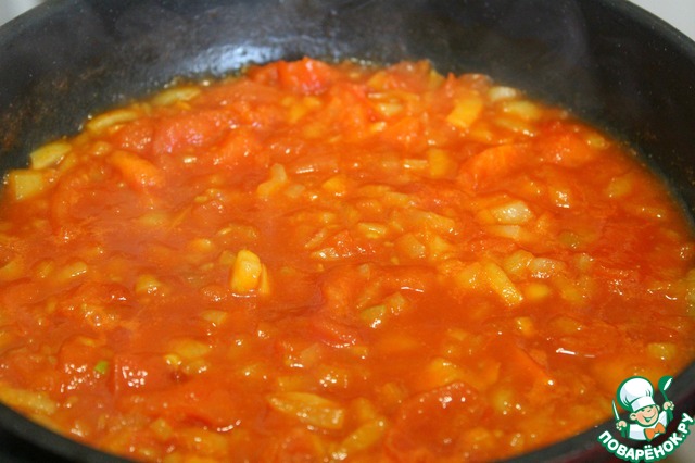 Добавить порезанный мелким кубиком лук, порезанные томаты или томаты в собственном соку, томат пасту, сахар и 50 мл воды, протушить 5 минут, всыпать специи, убрать из сотейника лавровый лист и палочку корицы.