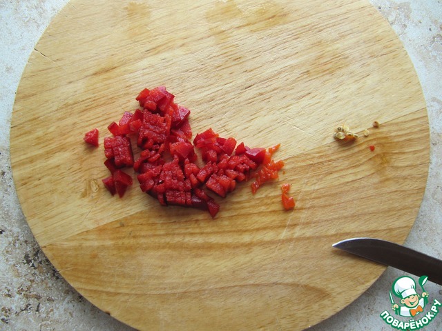 Сладкий перец нарезать мелким кусочком. Жгучий перец очистить от семян, мелко нарезать. Семена не использовать!