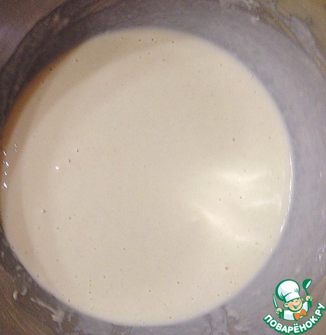 Выливаем воду с сахаром и солью в миску, добавляем муку и хорошо размешиваем. Оставляем тесто на 30 минут. Оставшуюся воду подогреваем до горячего состояния и понемногу вливаем в тесто. Добавляем масло, перемешиваем.