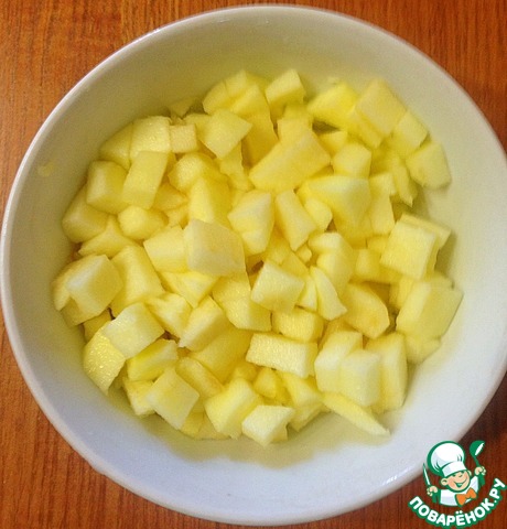 Параллельно чистим яблоко от кожуры и семян, нарезаем мелкими кубиками и поливаем соком лимона. Перемешиваем.