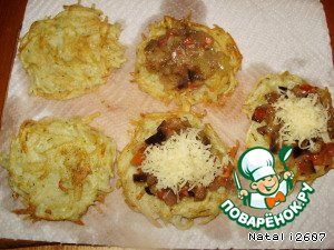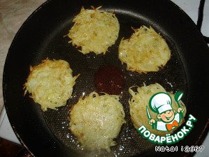 Обжарить из картофельной массы на растительном масле небольшие шайбочки, до золотистой корочки. Затем выложить на салфетку, чтоб излишки жира удалить.