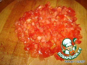 Помидор ошпарить кипятком и снять с него кожицу, тоже нарезать.