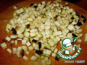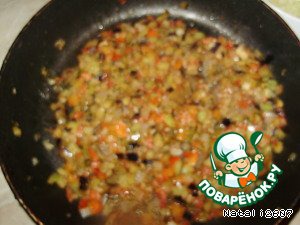На растительном масле обжарить баклажан, лук, перец сладкий. Затем добавить помидор и дать потушиться. Посолить, поперчить. Снять с огня и добавить чеснок.