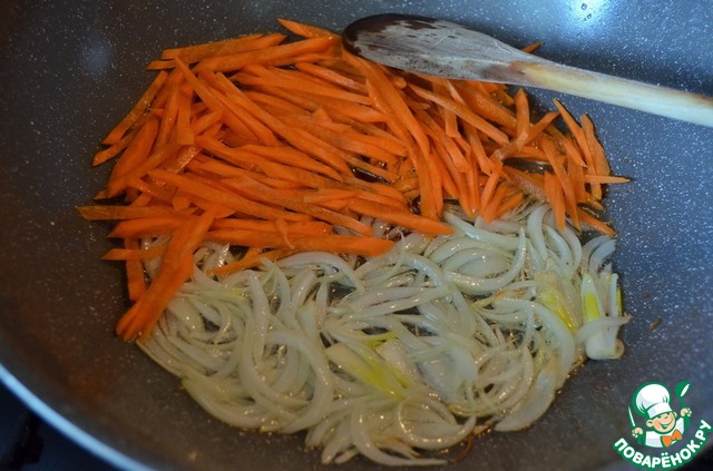 В глубокой сковороде разогреть масло и обжарить сначала лук, затем морковь. По 3-4 минуты.