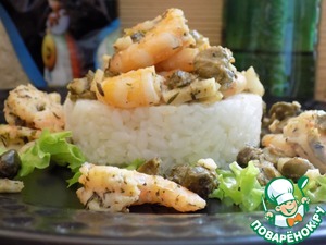 Подаём. Красиво выкладываем рис на салатные листья, а сверху креветки с каперсами.