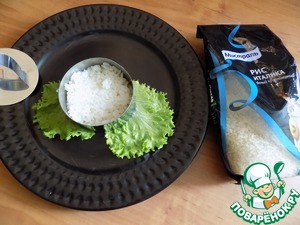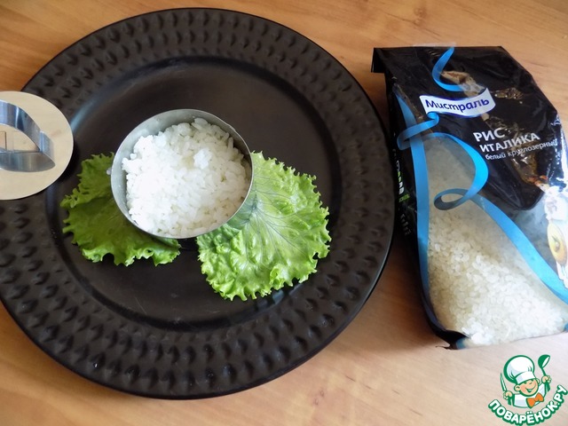 Рис для этого блюда выбрала ТМ МИСТРАЛЬ Италика. Рис круглый и очень вкусный. Варим рис, следуя указаниям на упаковке. Солим по вкусу. В готовый рис наливаем оливковое масло. Для подачи блюда я использовала кольцо. Выкладывала рис на салатные листья.