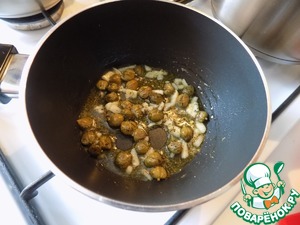 В сотейник наливаем масло оливковое и выкладываем мелко рубленный чеснок, добавляем тимьян и каперсы. Обжариваем немного.