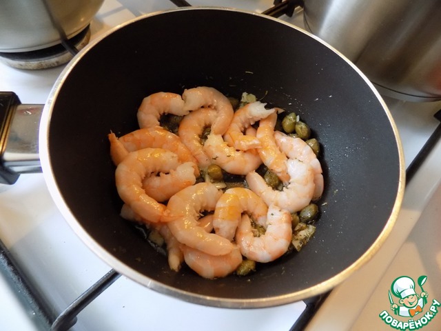 Выкладываем креветки и обжариваем их до готовности. Это минут 5-7. Прямо из лимона отжимаем сок 1 ст л примерно, поливая креветки. Ещё одна минутка и креветки готовы. Креветки можно посолить по вкусу. Я не солила. Мне хватило каперсов и лимонного сока. Перчим свежемолотым чёрным перцем по вкусу прямо в сотейнике, если есть не будут дети. Поперчить можно прямо в тарелке.