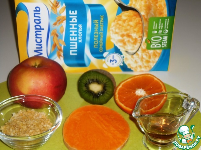 В миску насыпать пшенные хлопья, добавить яблоко, киви, тыкву и мандарин, влить кленовый сироп, все перемешать, если мало сладости, влейте ещё сироп.