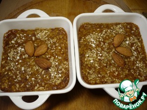 Когда овсяные хлопья и отруби впитали в себя жидкость. Выложить приготовленную тыквенно - овсяную массу в жаропрочные формочки (размер 14х11х4,5). Я украсила запеканку миндалем и посыпала овсяными хлопьями.