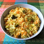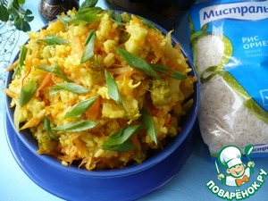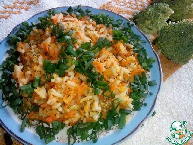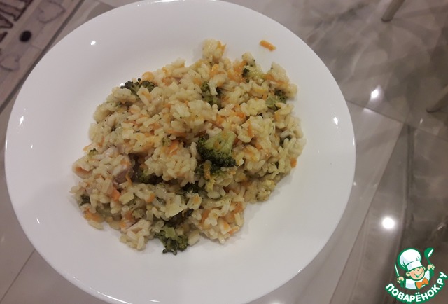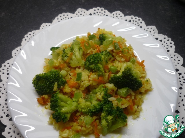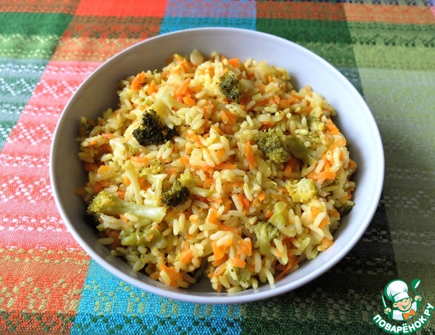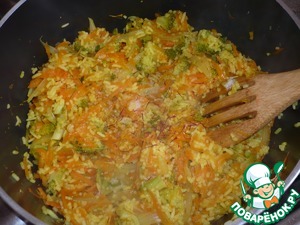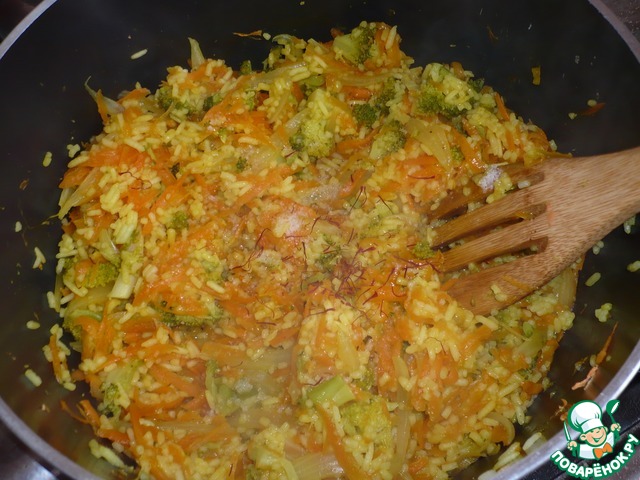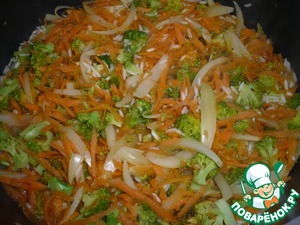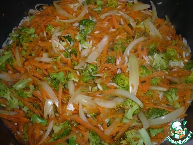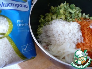 Сложить морковь в большую кастрюлю, добавить лук, рис и брокколи.