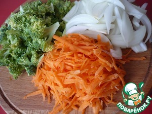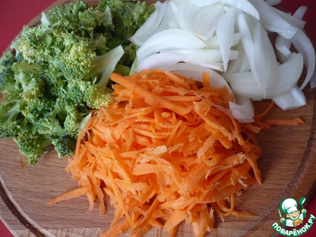 Морковь почистить и натереть на крупной терке. Брокколи мелко нарезать. Лук нарезать соломкой.