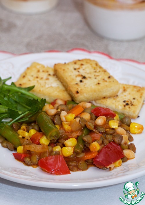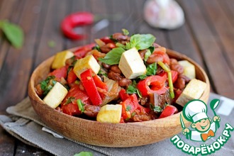 Добавляю морковь, лук, резаную фасоль, болгарский перец в томатной заливке. Довожу до вкуса солью и перцем. Тушу на низком огне 10-15 минут, периодически нужно мешать. Вкусно как в горячем, так и в холодном виде. В качестве гарнира использую жареный тофу.