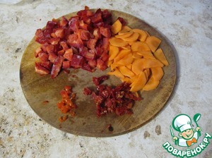 Болгарский перец, морковь, вяленые томаты, жгучий перец без семян нарезать произвольно.