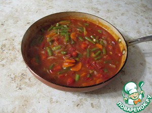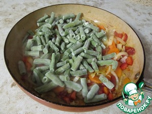 Добавить замороженную стручковую фасоль, прогреть несколько минут.