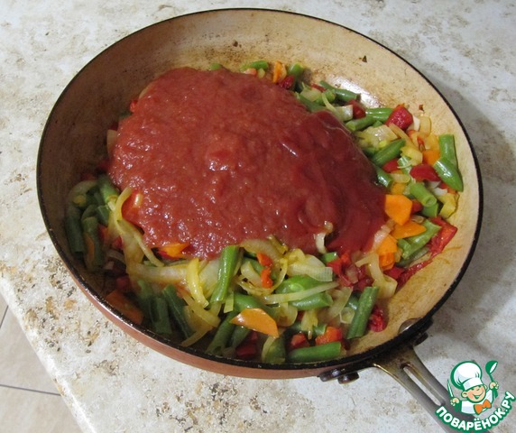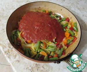 Добавить томатную пассату (пассерованые томаты или соус на выбор), количество зависит от вкусовых характеристик и густоты. По необходимости добавить воду, соль, паприку.