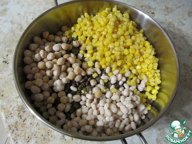 Для приготовления использую 3-х литровый сотейник. Нут, фасоль хранятся готовые к употреблению в морозильной камере, насыпаю по горсти, добавляю 1 банку сладкой кукурузы молочной спелости.