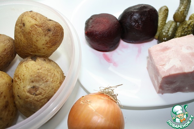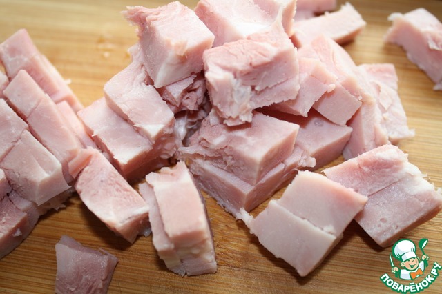 - Грудинка (или колбаса любая, иля мясо отварное или копченое) — 250 г