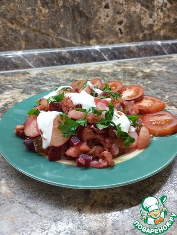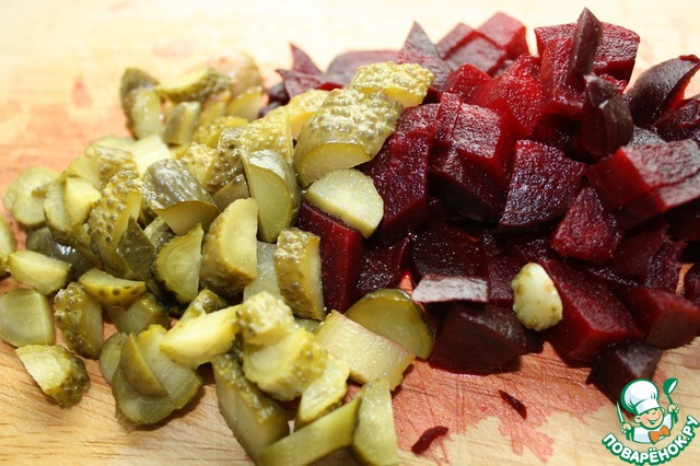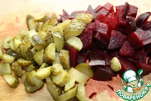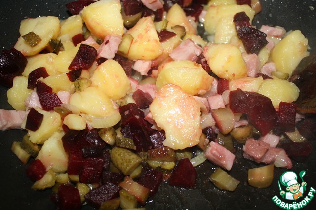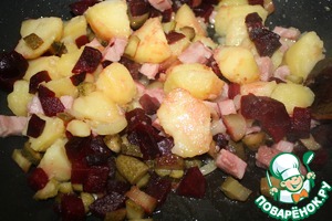 Добавить огурцы и свеклу и обжарить все вместе около 5 минут.